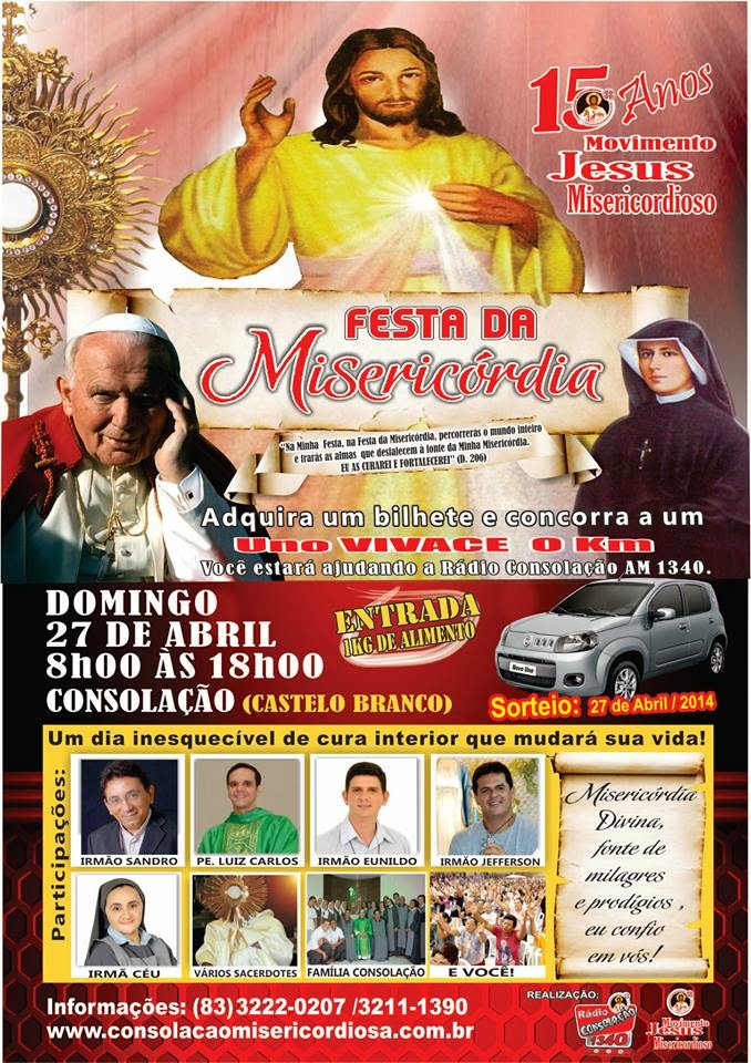 Amados(as) irmão(ãs), com alegria convidamos todos(as) vocês para a grande Festa da Misericórdia e os 15 anos do Movimento Jesus Misericordioso, que acontecerá no dia 27/04/2014. Presenças de vários sacerdotes, Ir. Sandro e toda Família Consolação.